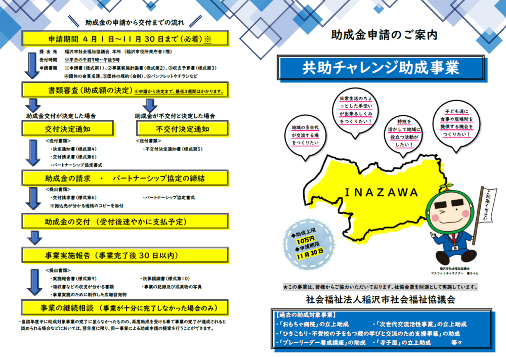 この度、令和8年度の助成申請受付を開始するとともに、同事業のパンフレットを作成しましたのでお知らせします。令和8年度の申請期限は11月30日(月)までです。先ずはご相談下さい。