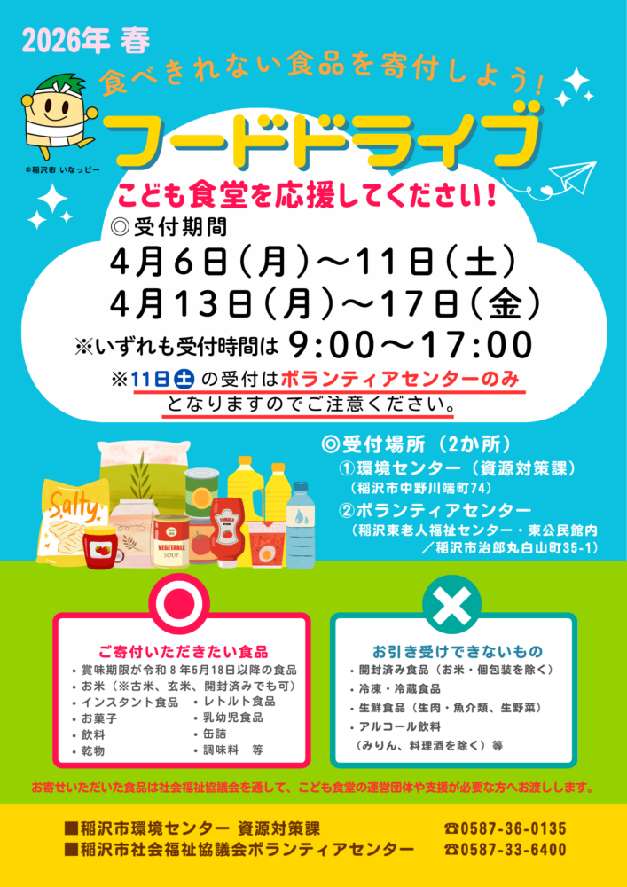 4月6日(月)から下記の日程で、環境センター及びボランティアセンターの2か所にてフードドライブを実施します。